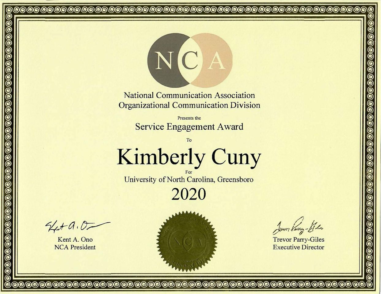 Big congratulations to Professor Kim Cuny on winning the 2020 Service Engagement Award from the Organizational Communication Division of the National Communication Association (NCA).